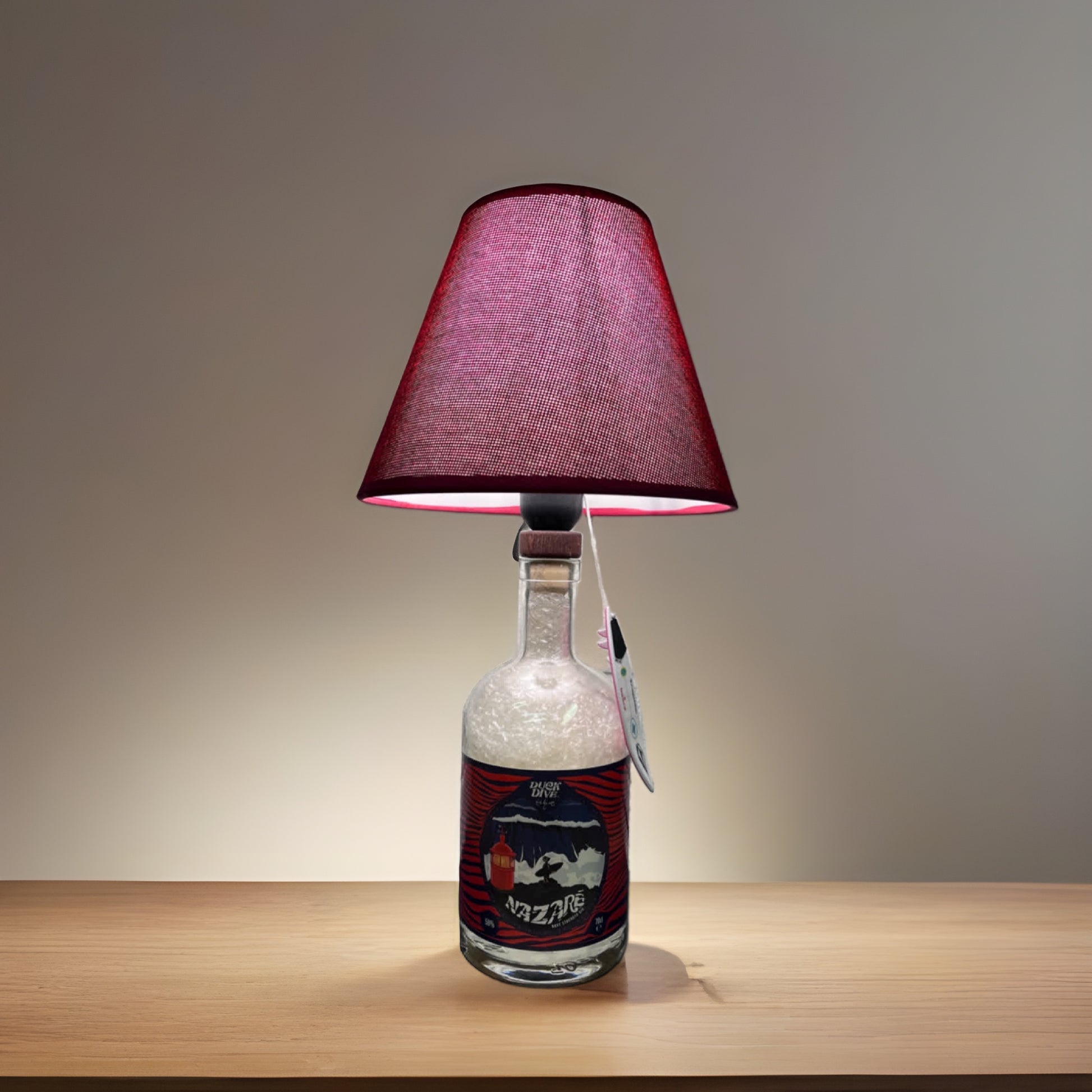Illumina la tua casa con stile con la bellissima LAMPADA NAZARE’. Realizzata con una bottiglia di gin nazare', il suo paralume rosso e l'interruttore fatto con una tavola da surf rendono omaggio all'onda gigante amata dai surfisti. La combinazione perfetta di stile e passione per il surf.